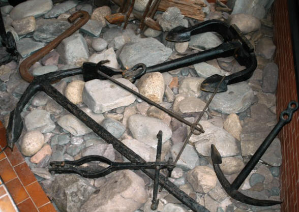 anchor = a metal device lowered on a line or chain and used to secure a vessel to the sea bed. Also used to secure nets. Anchors have flukes (points that dig into the bottom or grab rocks; the flattened part is called a palm) connecting by arms to a crown, a shank (a vertical bar) rising from the crown, many also have a stock (a horizontal bar that prevents rolling over) which passes through an eye, and a ring (where the rope or chain is attached). There are many different type and sizes of anchors, e.g. see killick, Admiralty pattern anchor, ice anchor and trawl anchor. |