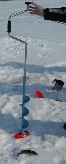 auger = a device used to drill holes in ice for ice fishing with nets or hook and line. May be powered or operated by hand.