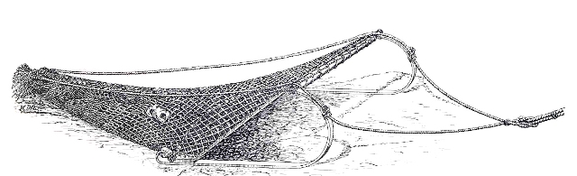 beam trawl = a trawl with short wings and a head rope attached to a metal or wooden beam 4-12 m long. The beam keeps the net open horizontally while metal frames on each end of the beam keep the net open vertically. The beam has metal runners to support it off the sea floor and the tapering bag net drags over the bottom. These trawls may have tickler chains to disturb the fish so the net does not ride over them. Experimental electrified ticklers have been developed to be less damaging to the sea bed. Beam trawls are used mainly for flatfish (and shrimp). |