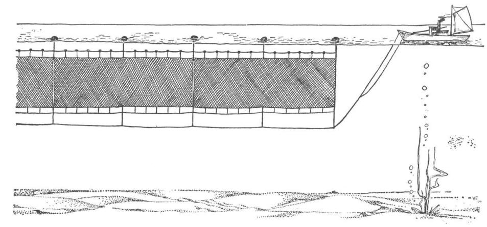 drift net = an unanchored gill net floating free with water currents or attached to a boat. Lost drift nets continue to catch and kill fish and marine mammals (called "walls of death") and large ones (50 km large scale pelagic driftnets) have been curtailed or banned on the high seas since 1991 by the Wellington Driftnet Convention and the 1993 UN General Assembly moratorium on large-scale drift nets. Also called drift gill net. |