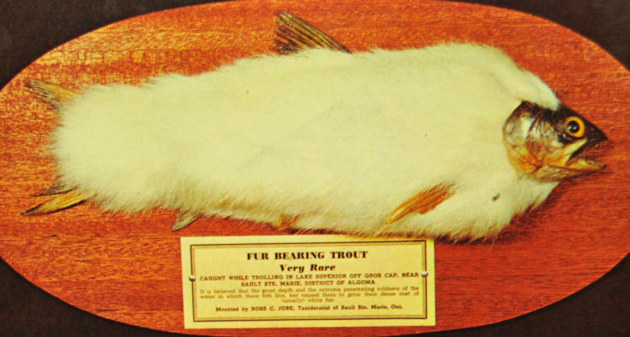 furfish = a taxidermist's mount of a fish, often a trout, wrapped in white fur and said to be a denizen of Canada's northern waters (or northern U.S. states). Sold to tourists. The original idea could be from fish infested with the fungus Saprolegnia which appears as tufts of "fur". The fungus continues to grow after the fish dies and is washed up on shore and can cover much of the body. |