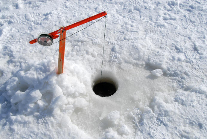 | ice fishing = fishing through holes cut in the ice of lakes or rivers, using specially designed gear and often with a shack positioned over the hole to mitigate the weather conditions. See also ice fishing under Symbols. |