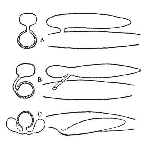 | From Kingsley's "Textbook of Vertebrate Zoology, 1906. A = most teleosts, B = Erythrinus, C= Polypterus, Calamoichthys and dipnoans. Photograph by Brian W. Coad. |