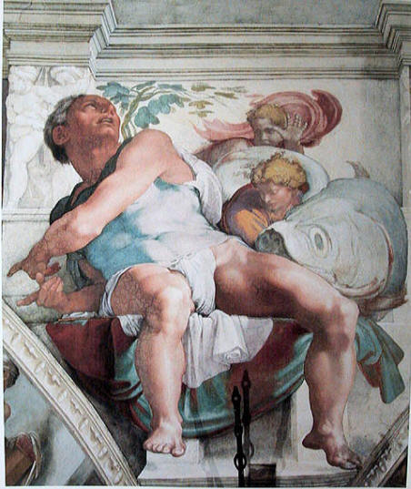 | Jonah in the Sistine Chapel by Michelangelo (1471-1484) from Wikimedia Commons: http://en.wikipedia.org/wiki/File:Sistine_jonah.jpg | |