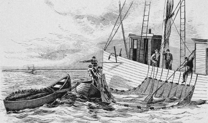 | Bailing menhaden (Brevoortia tyrannus) from a purse seine, National Marine Fisheries Service, Washington. Photograph by Brian W. Coad. |