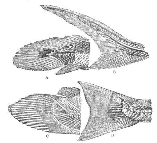 | A = diphycercal in Polypterus, B = heterocercal in Acipenser, C = homocercal in Amia and D = homocercal in Salmo from Kingsley's "Textbook of Vertebrate Zoology, 1906. Photograph by Brian W. Coad. |