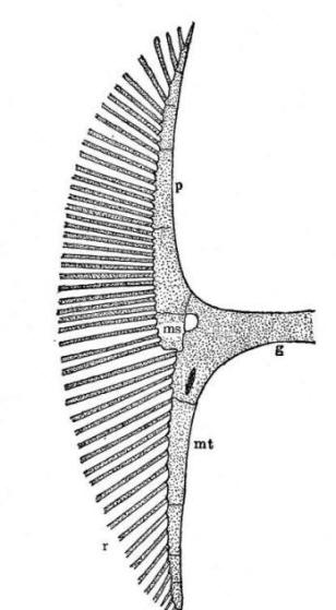 | Shoulder girdle and proximal part of pectoral fin of Raja, g = right half of girdle, ms = mesopterygium, mt = metapterygium, p = protopterygium, r = radii of fin, from Kingsley's "Textbook of Vertebrate Zoology, 1906. Photograph by Brian W. Coad. | |