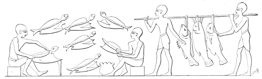 | Egyptians splitting and salting fish from Whymper's "The Fisheries of the World", 1883. Photograph by Brian W. Coad. |
