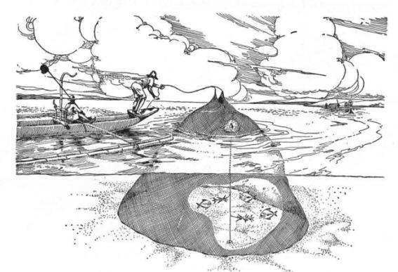 cast net = a method of catching fish in shallow waters by throwing a circular net over them; the net opens in the air to a diameter of about 2 metres and sinks rapidly because of weights attached to its margin. The rim of the net has a draw rope that enables it to be closed. A Newfoundland fisherman could catch 100 lbs (45.5 kg) of capelin in one throw. Also called throw net or trow net. |