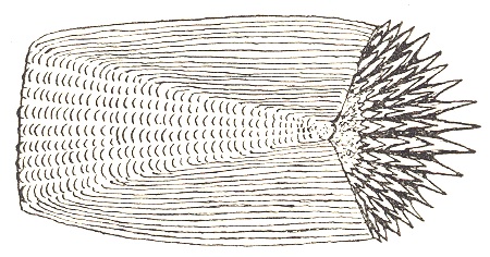 ctenoid scale = a scale having small spines (ctenii) on the posterior exposed portion and which hence feel rough when stroked towards the head. Typical of many Teleostei. |