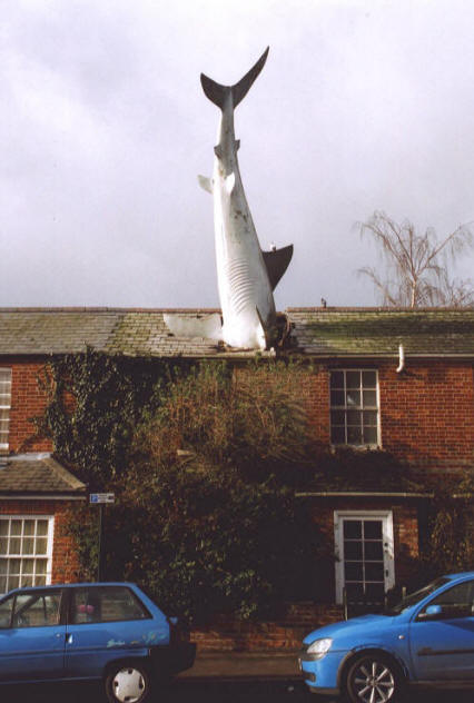 Headington shark = a 7.6 m model of a basking shark embedded head first in the roof of a house at 2 New High Street, Headington, Oxford. Said to represent an feeling of impotence, anger and desperation. Naturally controversial. |