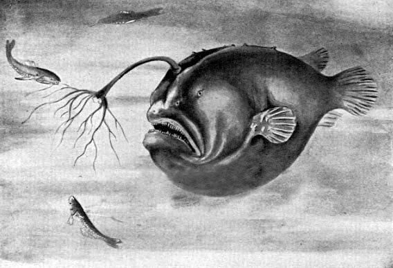 | Corynolophus reinhardti (= Himantolophus groenlandicus), from Jordan's "A Guide to the Study of Fishes", 1905. Photograph by Brian W. Coad. |
