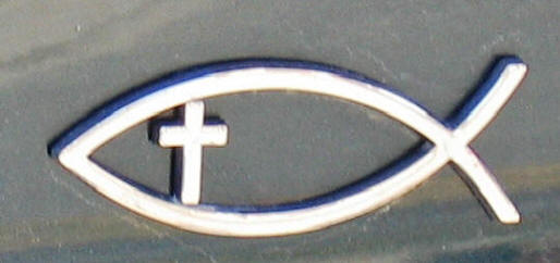| Jesus fish = the stylised symbol of a fish showing membership in the Christian religion. Often seen on the back of cars. May have a cross for the eye or the word Jesus occupying the central body of the symbol. See also vesica piscis (2). |