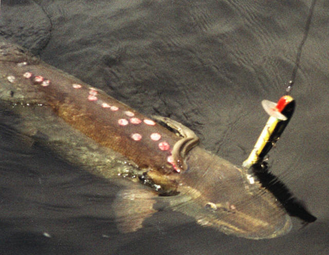 | Ichthyomyzon unicuspis and scars on Esox masquinongy, Ontario, Ottawa River offshore from L'Orignal Bay, October 1997, courtesy of Claude B. Renaud. |