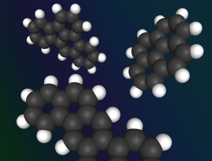 | Clockwise from top left, the molecules are: benz[e]acephenanthrylene, pyrene and dibenz[a,h]anthracene from Wikimedia Commons: http://commons.wikimedia.org/wiki/File:Polycyclic_Aromatic_Hydrocarbons.png |