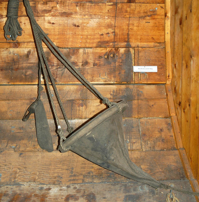 sea anchor = the American term for the British word drogue, namely a drag, usually a canvas-covered conical frame, floating behind a vessel to prevent drifting or to maintain a heading into the wind. |