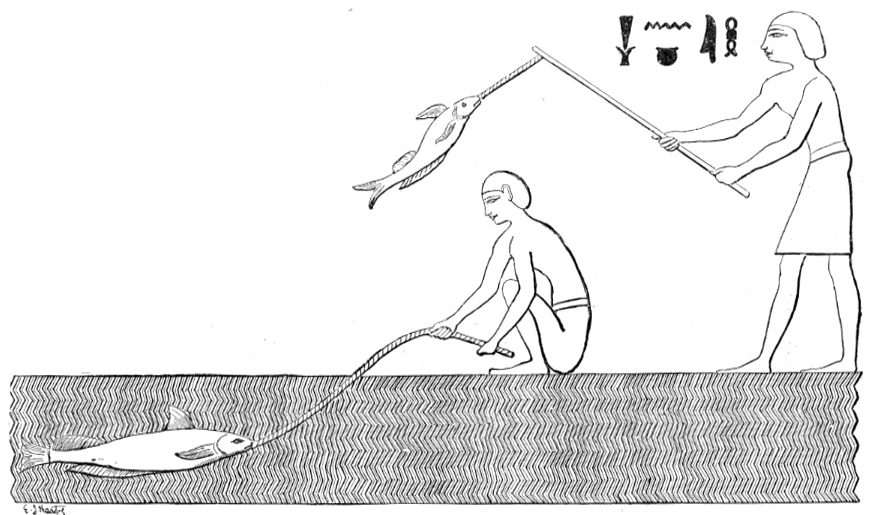 | Labelled Ninevites fishing but looks Egyptian. From Whymper's "The Fisheries of the World", 1883. Photograph by Brian W. Coad. |
