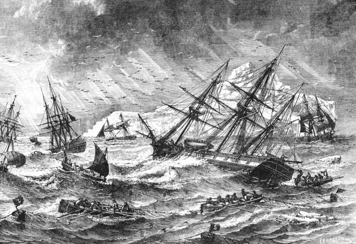 | Cod fishing on the Grand Banks of Newfoundland in the nineteenth century. From Whymper's "The Fisheries of the World", 1883. Photograph by Brian W. Coad. |