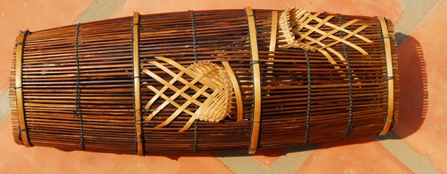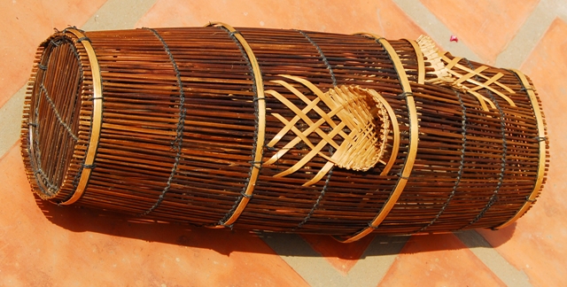 drum trap = a small fish trap in the shape of a cylindrical drum with entrance funnels, about 30 cm in diameter, made of local materials such as bamboo.