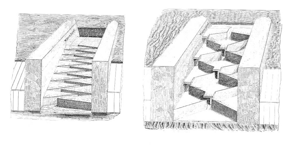 | fish-ladder = a series of steps with flowing water and pools enabling a fish to circumvent an obstruction such as a dam or waterfall by leaping from step to step. Also called fishway, fish pass. |