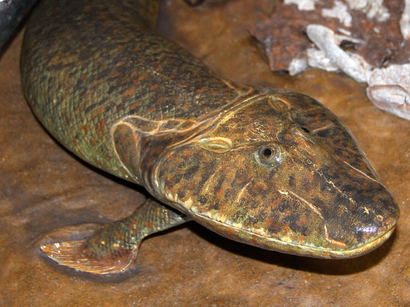 fishapod = nickname for the late Devonian fossil Tiktaalik roseae, a sarcopterygian from Ellesmere Island, Canada, an ancient fish with a mobile neck, limb development, lungs and ribs like tetrapods. As an intermediate form between fish and tetrapods, it is important in arguments for evolution over intelligent design. |