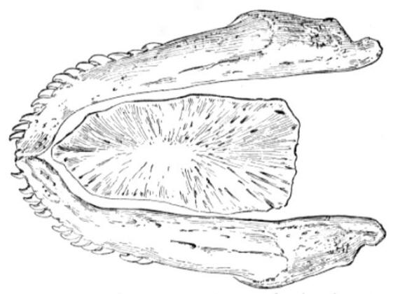 | gular plate = the median or paired, dermal, flat bone(s) between the lower jaws of primitive Teleostomes, below the basibranchials. There is a median gular in Amiidae and some Elopidae, Megalopidae and Albulidae, in some Dipnoi there is a second, posterior median plate while others have two pairs of gulars lateral to the median plate, and in Latimeria, Polypterus and Calamoichthys there is a median plate and a lateral plate on each side. Presumably gulars are serially homologous with branchiostegal rays. |