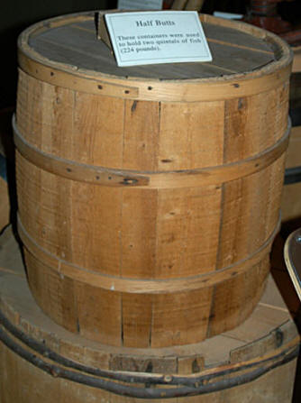 half-butt = a half-sized barrel used for storing and transporting dried fish. In Lunenburg, Nova Scotia held 2 quintals (224 pounds). |
