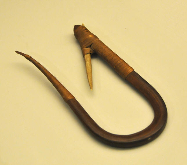 | Tlingit halibut hook from the Pacific coast of North America, made of wood, bone and vegetable fibre, XVIII century, Museo de América, Madrid. Photograph by Brian W. Coad. |