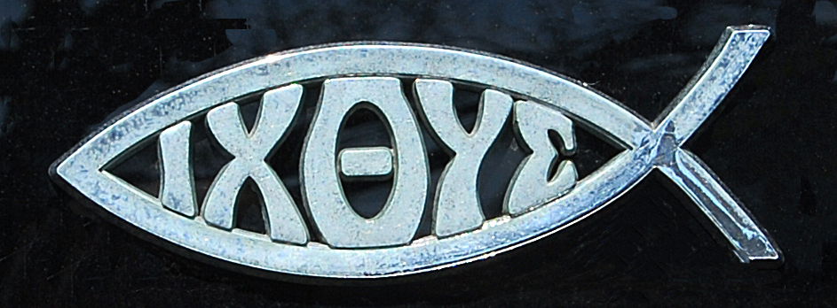 ichthus = 2) an iconographic symbol for Christ from the initials in the Greek phrase Iesous Christos Theou Huios Soter (Jesus Christ Son of God Saviour, ιχθύς in Greek); or representing Jesus as a fisher of men. |