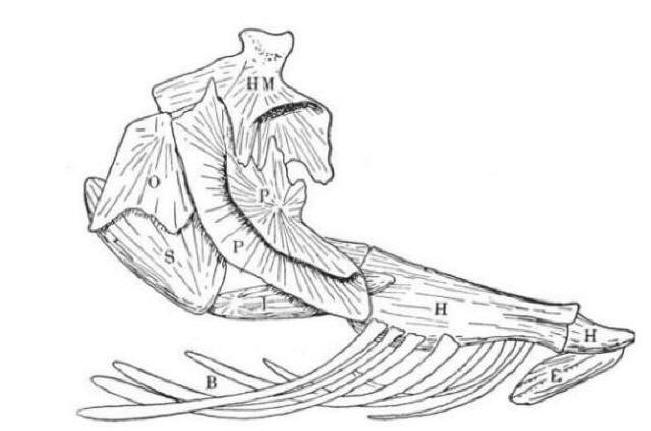 | Hyoid and opercular apparatus of Gadus, B = branchiostegals, E = os entoglossum, H = hyoid, HM = hyomandibula, I = interoperculum, O = operculum, P = preoperculum, S = suboperculum, from Kingsley's "Textbook of Vertebrate Zoology, 1906. Photograph by Brian W. Coad. |