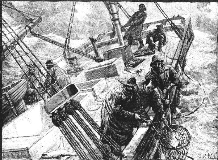 | Nineteenth century cod fishing from Whymper's "The Fisheries of the World", 1883. Photograph by Brian W. Coad. |