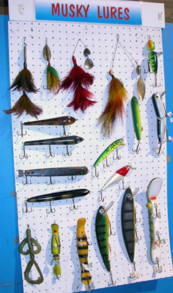 | Esox masquinongy lure display at a sportfishing show. Photograph by Brian W. Coad. |
