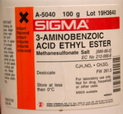 MS-222 = a fish anaesthetic applied by immersion in dosed water (tricaine methanesulphonate, methanesulfonate salt or 3-aminobenzoic acid ethyl ester (C9H11NO2• CH4SO3)). A white powder best transported across borders in its original container. |