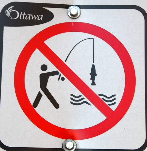 no fishing = appears in various forms, usually a fish inside a red circle with a diagonal bar denying permission, as with road signs.