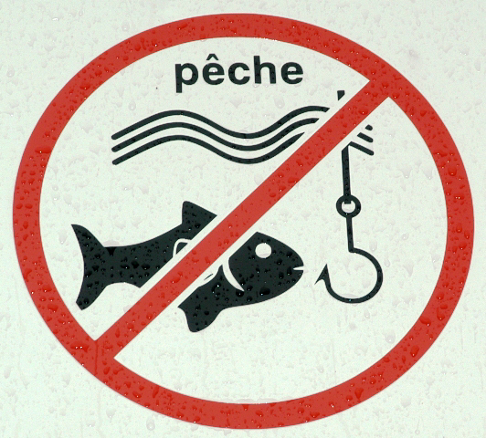 | no fishing = appears in various forms, usually a fish inside a red circle with a diagonal bar denying permission, as with road signs. |