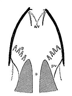| From Kingsley's "Textbook of Vertebrate Zoology, 1906. av = anterior oral valves open, g = gills, o = oesophagus, pv = posterior valves. The anterior valves close at expiration and the posterior ones open. The oral cavity enlarges and contracts through the motion of the oral walls, in heavy black here. Photograph by Brian W. Coad. |