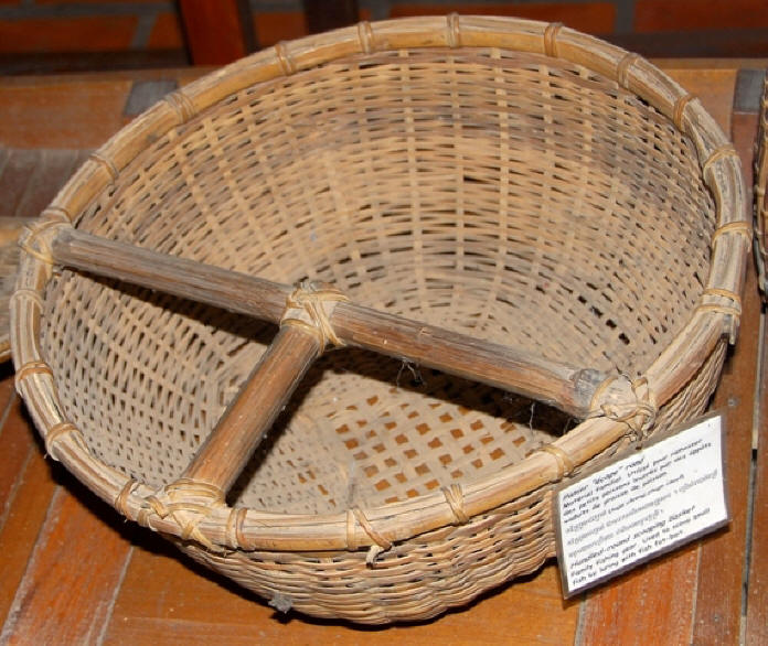 scoop basket = a basket made of wicker, plaited material, clothing and even spider webs in the shape of a scoop or shovel used to catch small fishes.