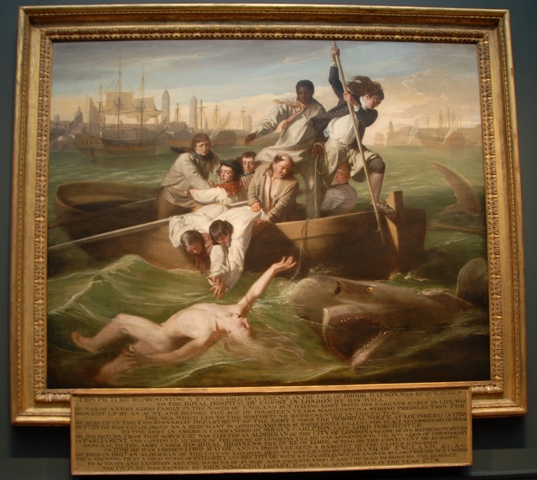| Watson and the Shark, a 1778 oil painting by John Singelton Copley showing 14-year-old Brook Watson being rescued from a shark attack on the third attempt in Havana, Cuba. Watson lost a leg. National Gallery of Art, Washington, D.C. Photograph by Brian W. Coad. |