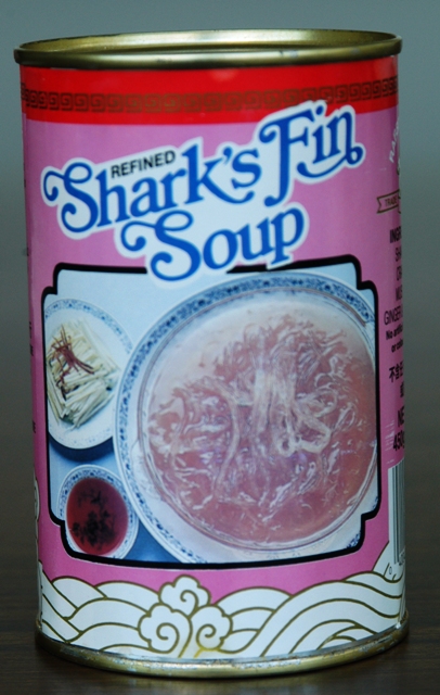 | shark fin soup = a Chinese soup made of shark fins according to various recipes. May include chicken broth, chicken breast, ham, scallops, mushrooms, green onions, ginger and other seasonings. The fins may need to be boiled for 2-3 days and the cartilaginous elements are tasteless; much of the taste comes from the other ingredients. Can cost $130 a bowl (in 2003). See finning. |