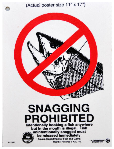 snagging = catching fish by means of unbaited hooks strung on lines. The fish swim into the hooks and are caught on them. Usually illegal. May also refer to inadvertent snagging when sport fishing with a bait or lure, the fish being hooked on some body part outside the mouth. l. |