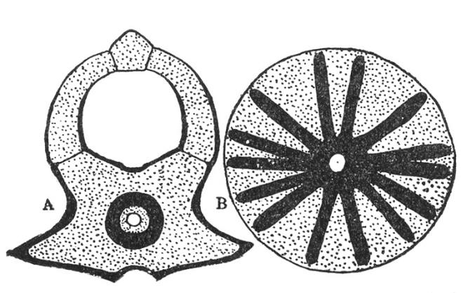 | Cyclospondylous (A) and asterospondylous (B) vertebra with cartilage calcifications in black, from Kingsley's "Textbook of Vertebrate Zoology, 1906. Photograph by Brian W. Coad. |