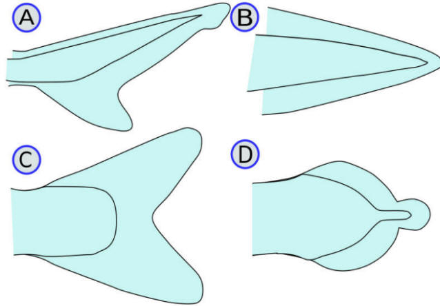 http://commons.wikimedia.org/wiki/File:PletwyRyb.svg. A = heterocercal, B = protocercal, C = homocercal, D = diphycercal. |