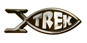 Trek fish = a parody of the Jesus fish and Darwin fish (both q.v.) showing an affection for the TV show Star Trek.