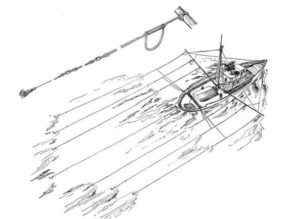 troll fishery = a commercial fishery in marine waters where gear is limited to multiple lures or baits trolled behind the boat (or troller), attached to lines suspended from long poles or outriggers. The lines are often hauled in by powered equipment. |